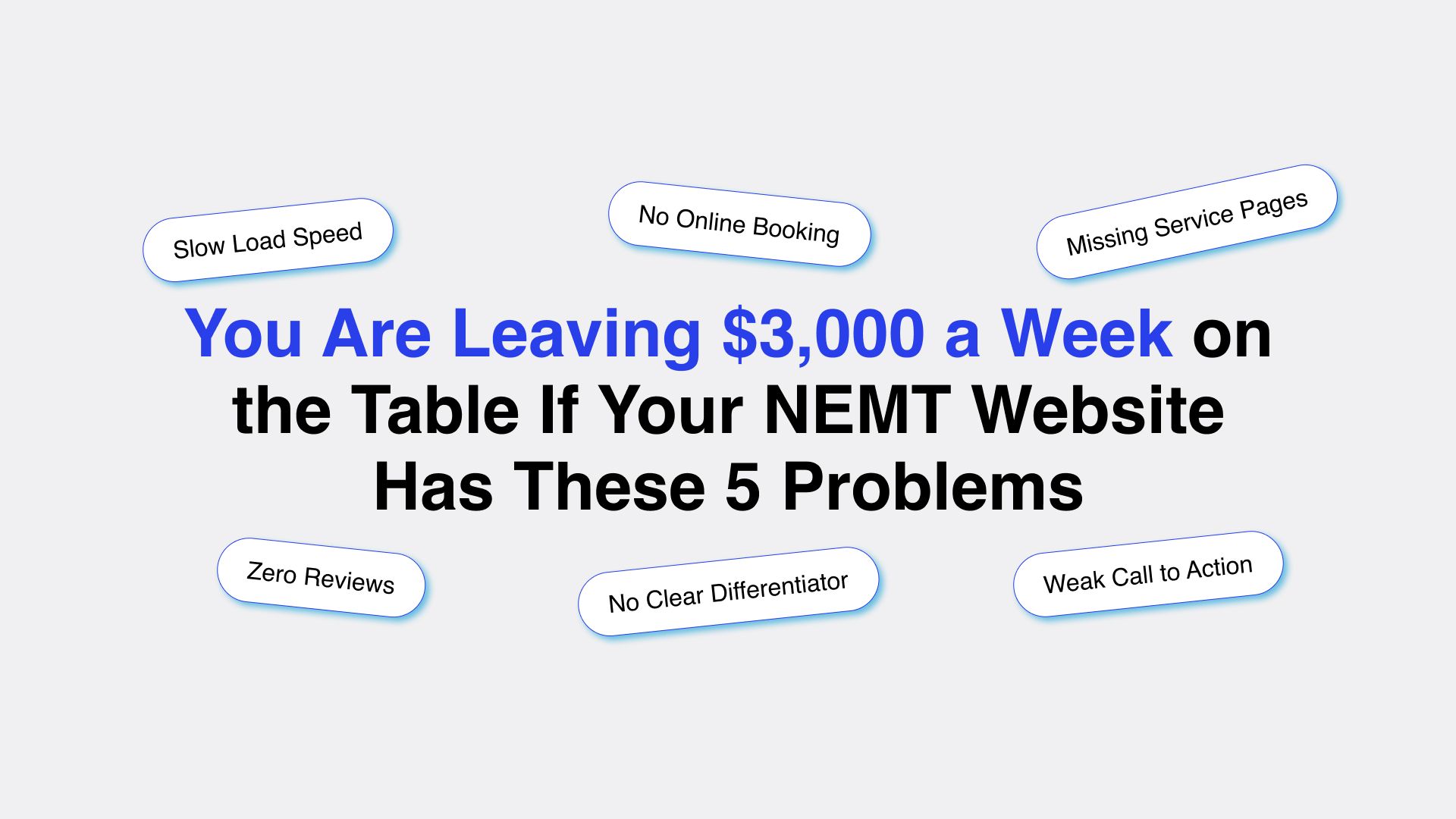 Most NEMT websites are losing bookings every single day without the owner knowing it. Slow load speed, no online booking, missing service area pages, zero reviews, and a homepage that says nothing specific are the 5 problems draining thousands in weekly revenue. This post breaks down exactly what each problem costs you and how to fix it.